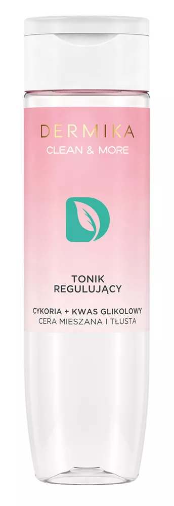 Dermika Clean&More to regulujący tonik, który dzięki swojej tonizującej formule delikatnie oczyszcza skórę, dbając jednocześnie o jej odpowiednie pH. Zawiera naturalny wyciąg z cykorii (inulina), który stanowi wsparcie dla mikrobiomu skóry, poprawiając jej zdrowy wygląd i chroniąc przed podrażnieniami. Kwas glikolowy w składzie toniku głęboko oczyszcza, przywracając balans skórze normalnej, mieszanej i tłustej.