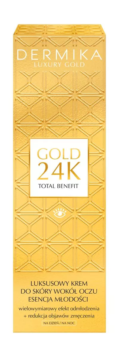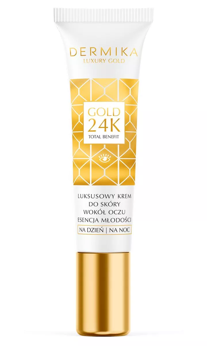 Odkryj luksusowy krem do skóry wokół oczu Dermika Luxury Gold 24K, który jest esencją młodości. Z wiekiem delikatna skóra wokół oczu traci jędrność, zmarszczki stają się bardziej widoczne, a blask spojrzenia przygasa. Dzięki formule z technologią kompleksowej odnowy Total Benefit, krem oferuje intensywną i całościową kurację odmładzającą, która dostosowuje się do potrzeb Twojej skóry, dodając jej subtelnego blasku i sprawiając, że wyglądasz młodziej.