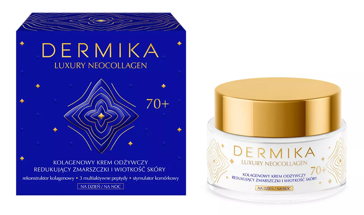 Dermika Luxury Neocollagen to kolagenowy krem odżywczy przeznaczony dla osób 70+, który skutecznie redukuje zmarszczki oraz poprawia jędrność skóry. Dzięki innowacyjnej formule opartej na rekonstruktorze kolagenowym z izolatów nanoplanktonu oraz multiaktywnych peptydach, krem przywraca skórze gęstość, jędrność oraz witalność.