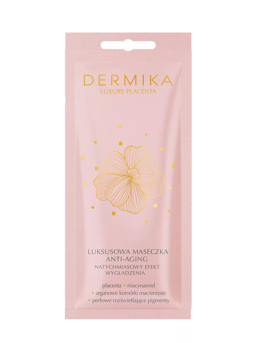 Dermika Luxury Placenta Luksusowa Maseczka Anti-Aging Natychmiastowy Efekt Wygładzenia to wyjątkowy kosmetyk, który uwodzi swoim działaniem. Innowacyjne połączenie roślinnej placenty z komórkami macierzystymi z drzewa arganowego stymuluje skórę od wewnątrz, pobudzając procesy regeneracyjne i zdolność do samonaprawy. Niacynamid wspiera syntezę kolagenu, wygładzając skórę i dbając o jej promienny wygląd. Masło shea i olej awokado skutecznie odżywiają i chronią skórę. Dodatkowo, mikroskopijne rozświetlające perłowe drobinki natychmiast nadają cerze olśniewający blask, optycznie zmniejszając widoczność zmarszczek.