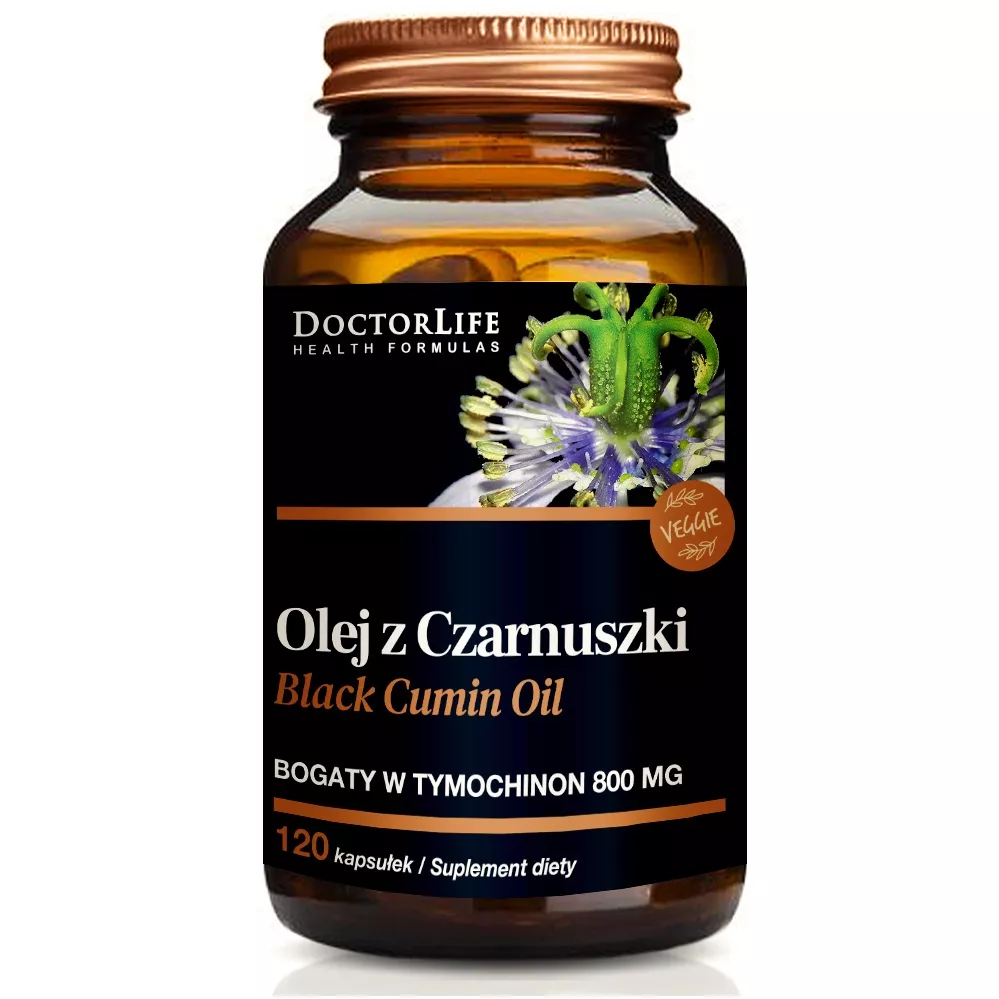 Doctor Life Black Cumin Oil to wysokiej jakości suplement diety w formie oleju z czarnuszki, dostępny w wegetariańskich kapsułkach 1000 mg. Ten nierafinowany, tłoczony na zimno olej jest wolny od GMO i stanowi bogate źródło tymochinonu oraz kwasu linolowego (ponad 50%).