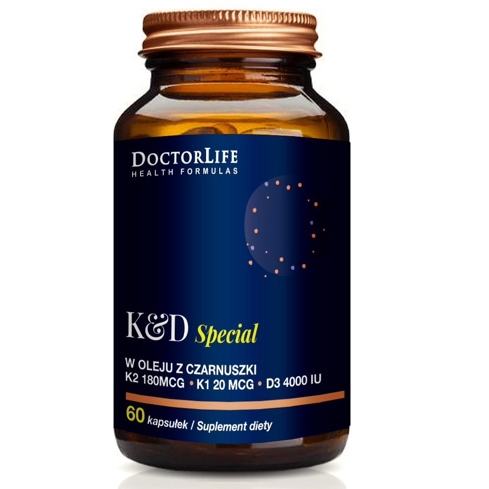 Doctor Life K & D Special w oleju z czarnuszki to suplement diety łączący kluczowe witaminy K2, K1 i D3 w unikalnej, synergicznej formule dla zdrowia twoich kości i tętnic. Dzięki zastosowaniu organicznego oleju z czarnuszki, witaminy te są łatwiej przyswajalne i skuteczniejsze.