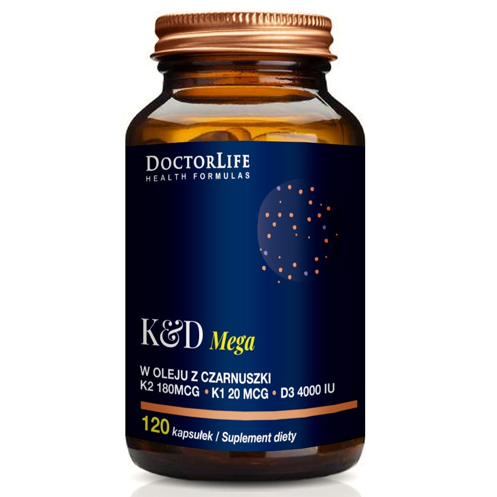 Doctor Life K&D Mega to wyjątkowy suplement diety, który łączy w sobie dwie kluczowe witaminy - K2 i D3 - w unikalnej formule zapewniającej ich maksymalną przyswajalność. Witaminy te, rozpuszczalne w tłuszczach, zostały połączone z organicznym olejem z czarnuszki, co gwarantuje ich skuteczny transport i wchłanianie. Produkt wspiera zdrowie kości i układu krążenia, a także dostarcza niezbędne składniki odżywcze dla osób dbających o serce.