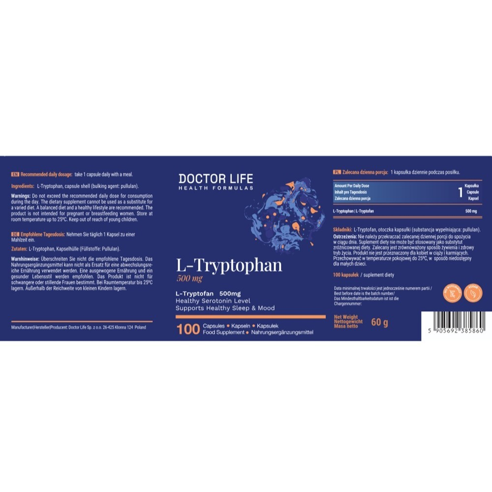 Doctor Life L-Tryptophan 500mg to wysokiej jakości suplement diety zawierający L-tryptofan – niezbędny aminokwas egzogenny, którego organizm człowieka nie potrafi samodzielnie syntetyzować. Jako naturalny prekursor serotoniny, L-tryptofan wspiera prawidłowe funkcje układu nerwowego, bierze udział w regulacji nastroju i snu, a także uczestniczy w biosyntezie białek. Produkt szczególnie polecany jest w okresach zwiększonego napięcia psychicznego, zmęczenia oraz przy wzmożonym wysiłku umysłowym.