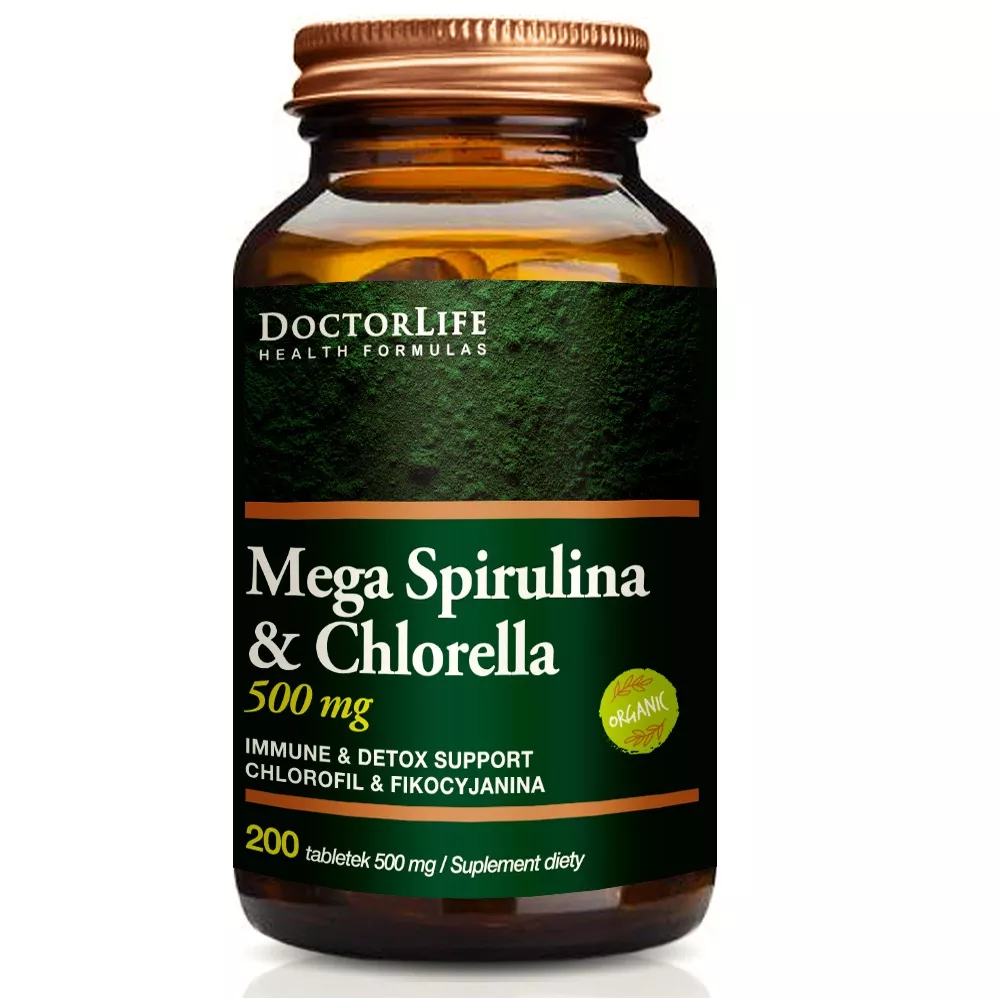 Doctor Life Mega Spirulina & Chlorella 500mg, 200 tabletek to zaawansowany suplement diety, który łączy zalety dwóch najbardziej odżywczych mikroalg: chlorelli oraz spiruliny. Produkt pochodzi z najczystszych, świeżych wód i jest hodowany w perfekcyjnie dopracowanym procesie, co potwierdza certyfikat organiczności.