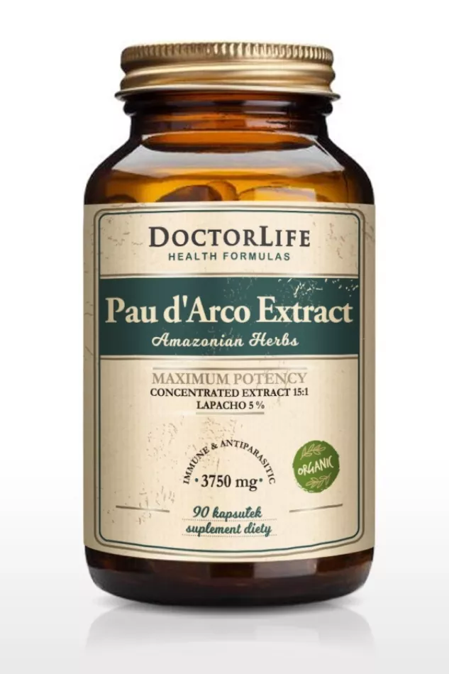 Doctor Life Pau d'Arco to wysokiej jakości suplement diety zawierający ekstrakt z organicznej kory wewnętrznej Pau d'Arco, znanej jako "herbata Inków". Produkt oferuje niezwykłą koncentrację składników aktywnych dzięki standaryzacji na 5% lapacholu i potencjałowi 15:1, co czyni go znacznie bardziej wartościowym niż zwykła sproszkowana kora. Każda kapsułka odpowiada aż 3750 mg kory, co równa się niemal 8 kapsułkom sproszkowanego surowca.