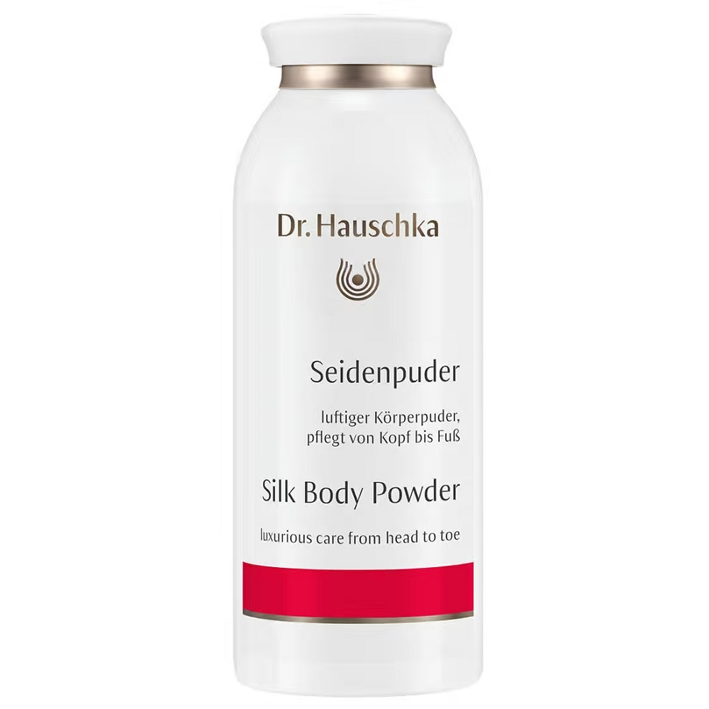 Dr. Hauschka Silk Body Powder to jedwabny puder do ciała, który zapewnia niezawodną ochronę i pielęgnację skóry. Dzięki unikalnej kompozycji pudru jedwabnego, wzbogaconej o wyciągi roślinne z szałwii, gencjany oraz kory dębu, produkt łagodzi podrażnienia i zapewnia delikatne działanie dezodorujące, stabilizując mikroflorę skóry. Skóra staje się naturalnie matowa, a kosmetyk jest szczególnie polecany do łagodnej pielęgnacji skóry wrażliwej. Aksamitnie delikatny puder łagodnie pielęgnuje całe ciało.