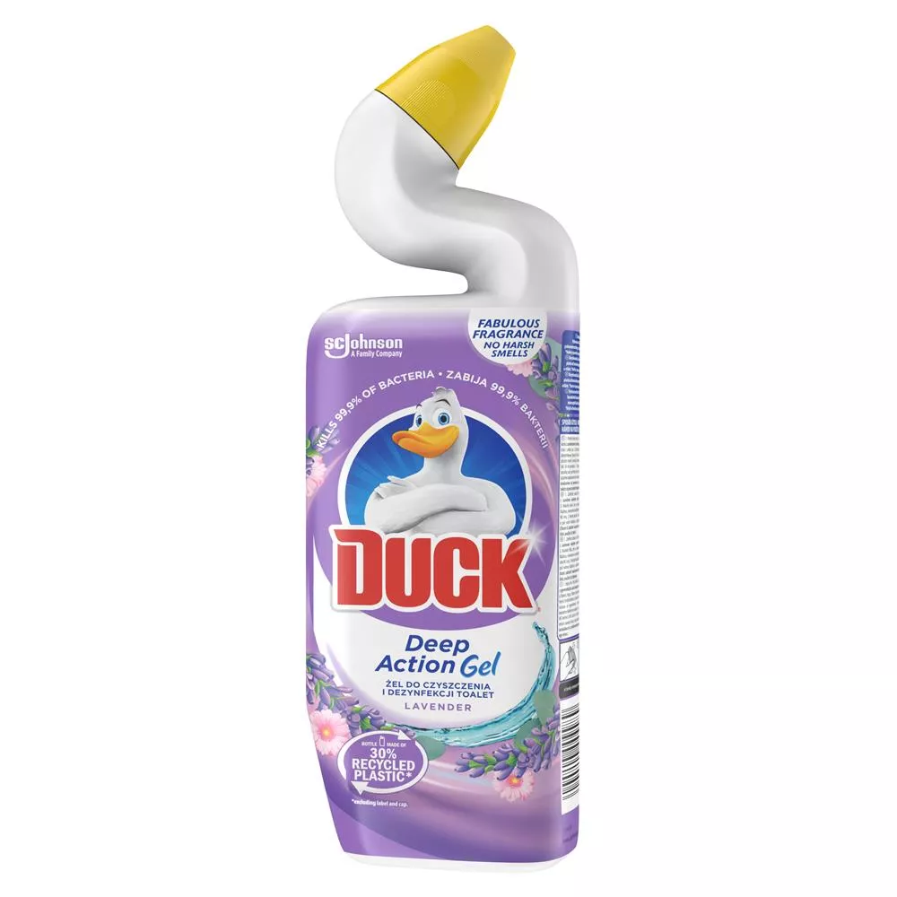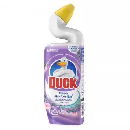 Duck Deep Action Lavender Żel do czyszczenia i dezynfekcji toalet posiada przyjemny, lawendowy zapach. Produkt charakteryzuje skuteczne działanie, likwiduje do 99,9% bakterii. Unikalna szyjka zapewnia lepsze dotarcie do każdego miejsca. Butelka została wykonana w 30% z plastiku pochodzącego z recyklingu. Zapewnij sobie lepsze czyszczenie wraz z Duck Deep Action do czyszczenia i dezynfekcji toalet