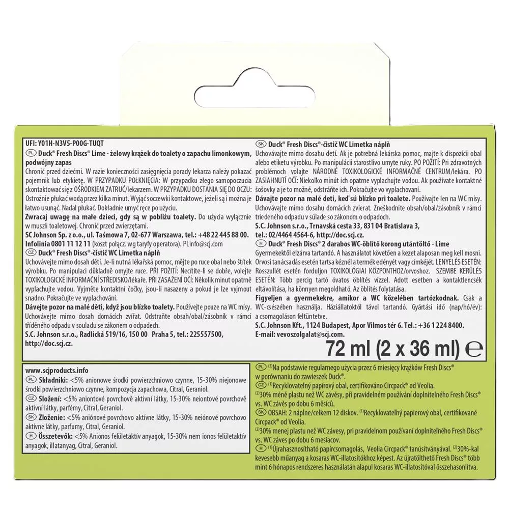 Duck Fresh Discs trzyma z dala zabrudzenia i nieprzyjemne zapachy od twojej toalety oraz odświeża ją przy każdym spłukaniu, nadając toalecie odświeżającego limonkowego zapachu. Nasza unikalna formuła przy każdym spłukaniu aktywuje osłonę ochronną, która pomaga zapobiegać osadzaniu się kamienia. Jest łatwy w użyciu! Użyj plastikowego uchwytu i zaaplikuj żelowy krążek na muszli klozetowej. Jeden świeży krążek pomaga utrzymać muszlę klozetową w czystości i połysku nawet przez 6 tygodni.
