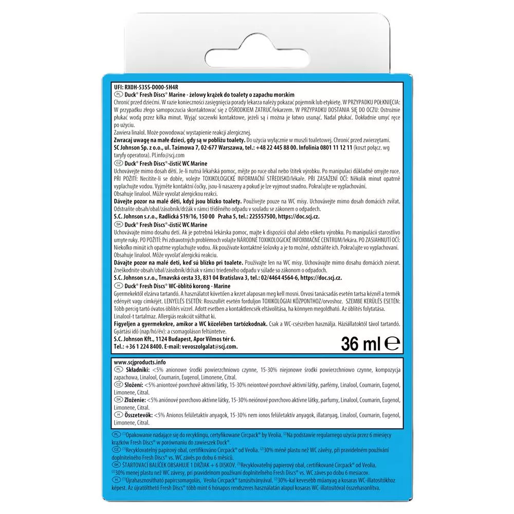 Duck Fresh Discs trzyma z dala zabrudzenia i nieprzyjemne zapachy od Twojej toalety oraz odświeża ją przy każdym spłukaniu, nadając toalecie przyjemnego morskiego zapachu.