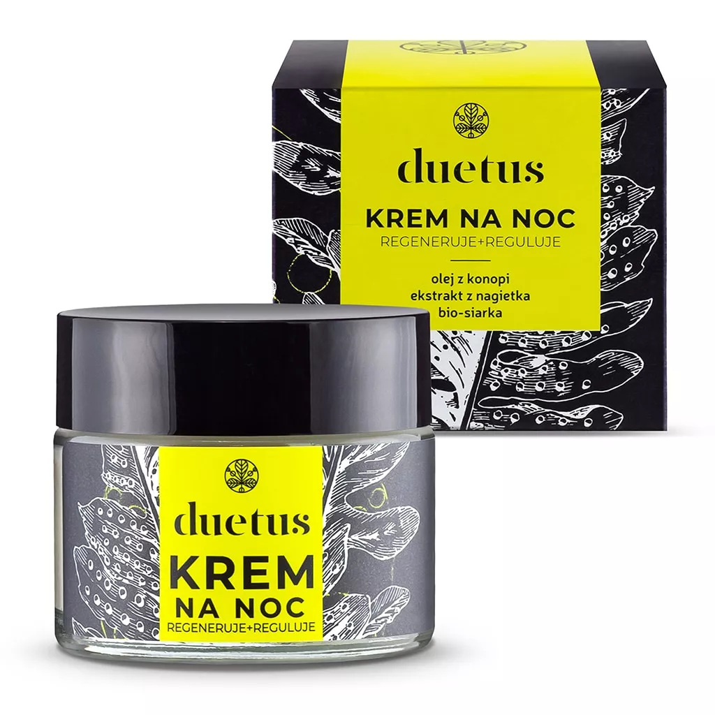 Lekki krem Duetus do wieczornej pielęgnacji cery mieszanej lub z niedoskonałościami zapewnia optymalne nawilżenie i odżywienie. Dzięki kompleksowi olejów z pestek winogron, konopi i czarnuszki oraz bio-siarki, krem reguluje wydzielanie sebum, redukuje wypryski i przyspiesza regenerację skóry. Ekstrakt z nagietka i witamina E chronią przed działaniem czynników zewnętrznych i łagodzą podrażnienia, a naturalne olejki eteryczne z grejpfruta i tymianku pozostawiają skórę wyraźnie odświeżoną.