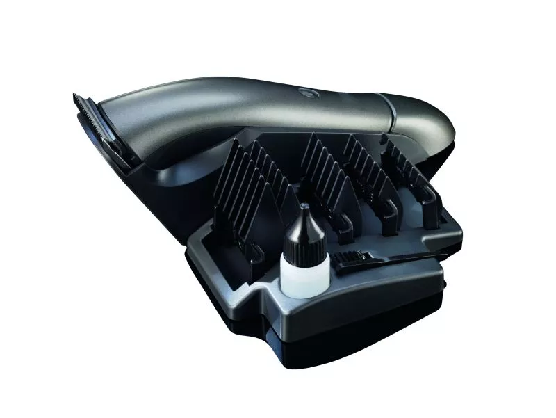 - Zestaw zawiera: stację ładującą, 5 nasadek grzebieniowych (4, 8, 12, 16, 20 mm), olejek oraz szczoteczkę do czyszczenia