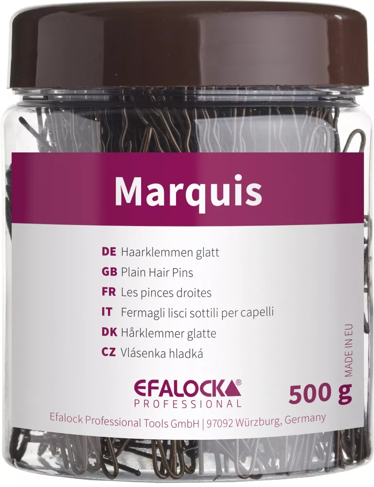 Wsuwki do włosów Efalock Marquis to doskonały wybór dla osób szukających wysokiej jakości akcesoriów do stylizacji. Każde opakowanie zawiera około 380 prostych wsuwek o długości 7 cm, dostępnych w eleganckim brązowym kolorze. Wsuwki te są idealne do tworzenia różnorodnych fryzur, zapewniając pewne i dyskretne utrzymanie włosów na miejscu.