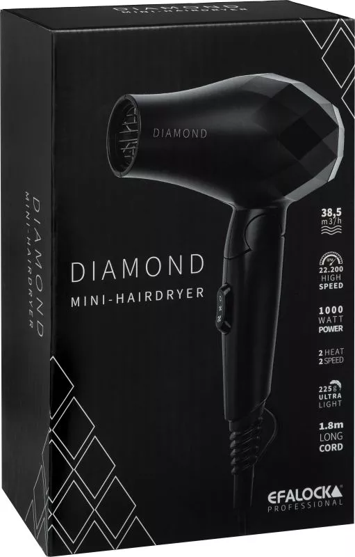 Efalock Diamond Mini to suszarka do włosów, która łączy kompaktowe wymiary z wysoką mocą, idealna dla osób często podróżujących. Dzięki składanej rączce i niewielkim rozmiarom, bez problemu zmieści się w każdej walizce. Wyposażona w dwa poziomy prędkości i temperatury, a także funkcję zimnego nawiewu, zapewnia utrwalenie fryzury i chroni włosy przed puszeniem. Ceramiczna obudowa zapobiega przegrzewaniu się włosów, nadając im zdrowy połysk.