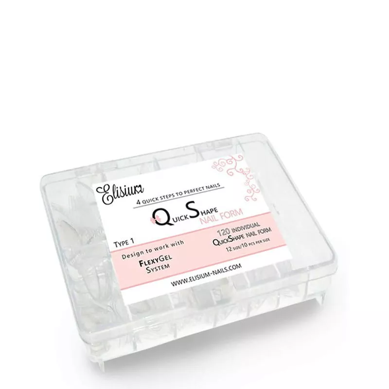 Quick Shape Nail Form w typie 1 posiadają łagodniejszą krzywą C, dzięki którym uzyska się delikatniejszą linię paznokcia. Nowoczesna technika przedłużania paznokci formami Quick Shape Nail Form pozwala zyskać piękne, gładkie paznokcie o wymarzonej krzywej „C” w znacznie krótszym czasie niż w przypadku przedłużania na tradycyjnej formie. Formy Quick Shape Nail Form dedykowane są pracy z FlexyGelem, gdyż jest wystarczająco gęsty, elastyczny i pozwala się modelować do woli. Quick Shape Nail Form są wielokrotnego użytku. Opakowanie zawiera: 120 sztuk form w 12 rozmiarach(dwa najmniejsze rozmiary z form są podwójne).