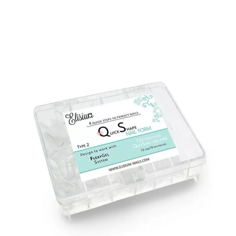 Quick Shape Nail Form w typie 2 posiadają mocniejszą krzywą C, dzięki którym uzyska się wyraźniejszą linię paznokcia. Nowoczesna technika przedłużania paznokci formami Quick Shape Nail Form pozwala zyskać piękne, gładkie paznokcie o wymarzonej krzywej „C” w znacznie krótszym czasie niż w przypadku przedłużania na tradycyjnej formie. Formy Quick Shape Nail Form dedykowane są pracy z FlexyGelem, gdyż jest wystarczająco gęsty, elastyczny i pozwala się modelować do woli. Quick Shape Nail Form są wielokrotnego użytku. Opakowanie zawiera: 120 sztuk form w 12 rozmiarach(dwa najmniejsze rozmiary z form są podwójne).