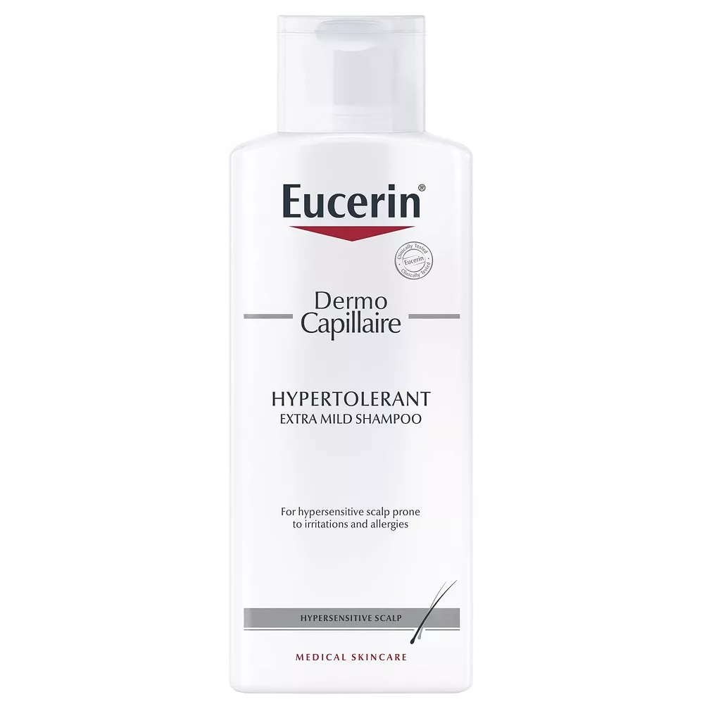 Eucerin DermoCapillaire Hypertolerant to łagodzący szampon do włosów stworzony specjalnie dla osób z bardzo wrażliwą skórą głowy. Dzięki niezwykle delikatnej formule, szampon ten skutecznie oczyszcza włosy i skórę głowy, jednocześnie zapobiegając jej wysuszeniu. Już od pierwszego użycia łagodzi swędzenie, przynosząc ulgę.