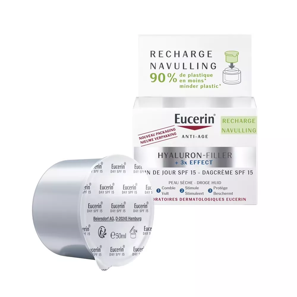 Eucerin Hyaluron-Filler + 3x Effect krem na dzień SPF15 do skóry suchej Refill 50ml to doskonały wybór dla osób poszukujących intensywnej pielęgnacji suchej skóry. Ten krem z kwasem hialuronowym skutecznie wygładza zmarszczki, nawilża skórę i zapobiega jej przedwczesnemu starzeniu. Dzięki unikalnej formule zapewnia efekt wypełnienia i widoczną redukcję nawet wyraźnych zmarszczek.