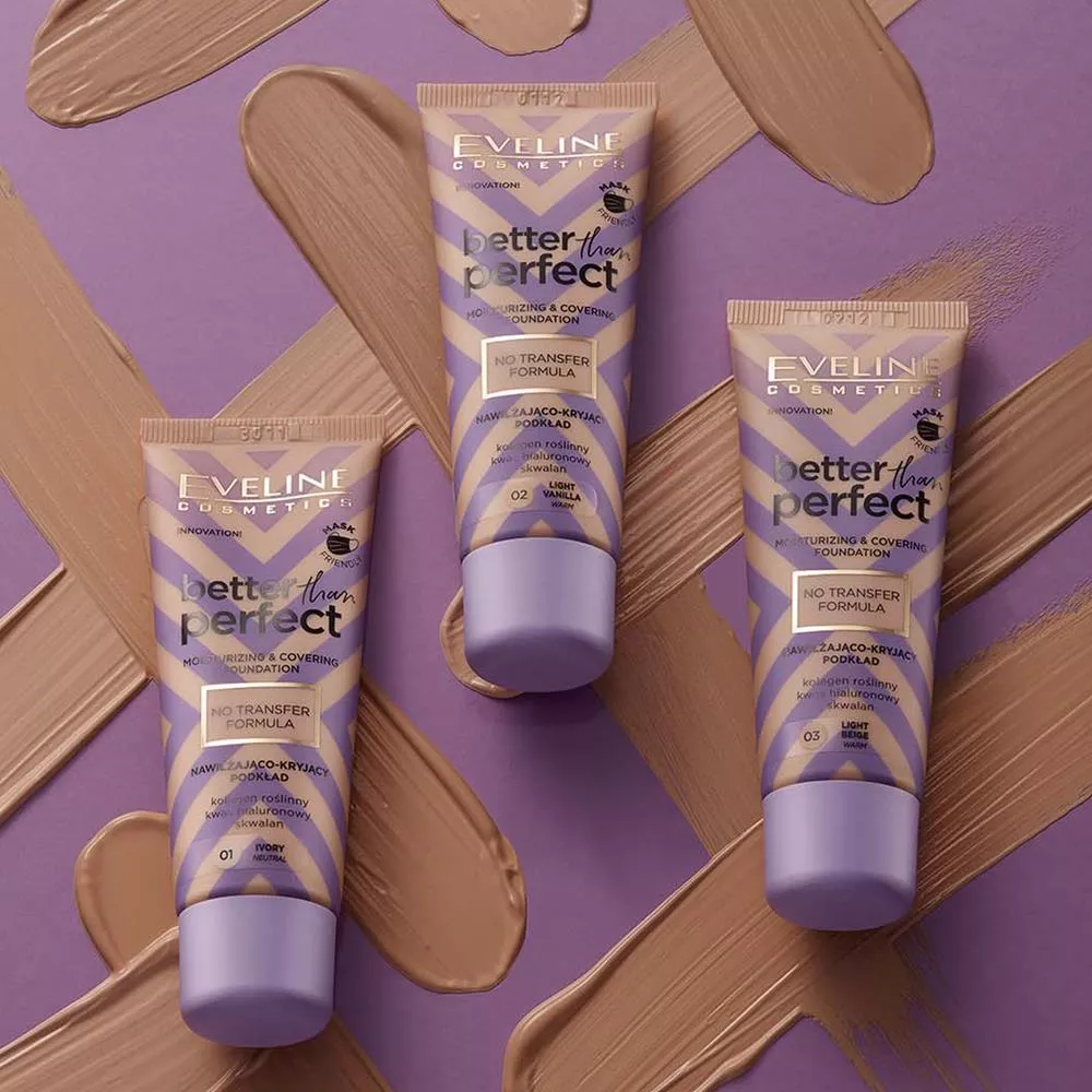 Eveline Better Than Perfect to nawilżająco-kryjący podkład nowej generacji z innowacyjną formułą no transfer, która zapewnia trwały makijaż odporny na ścieranie. Idealny dla osób, które pragną utrzymać nieskazitelny wygląd bez obaw o ślady na maseczce czy ubraniu. Ten lekki podkład skutecznie wyrównuje koloryt cery, nadając jej naturalny, promienny wygląd oraz umożliwia stopniowanie krycia, aby zamaskować wszelkie niedoskonałości.