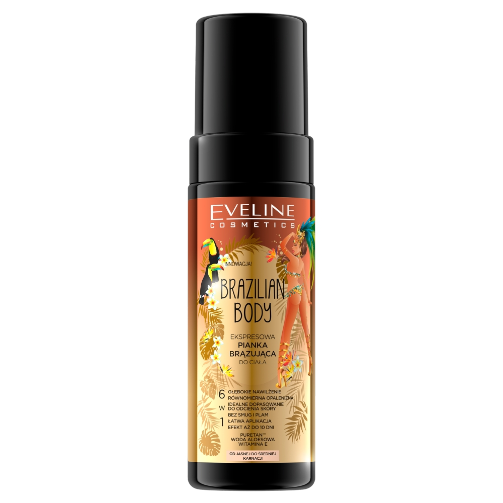Eveline Brazilian Body to ekspresowa pianka brązująca do ciała, która już po pierwszej aplikacji zapewnia naturalną, złocistą opaleniznę bez smug i plam. Dzięki innowacyjnemu kompleksowi PURETAN™ zauważysz efekty natychmiastowo, a opalenizna będzie się pogłębiać i utrwalać nawet do 5 godzin po zastosowaniu. Aksamitna formuła pianki łatwo się rozprowadza, a jej delikatnie brązowy kolor pozwala na precyzyjną i równomierną aplikację. Produkt został wzbogacony o wodę aloesową i witaminę E, które intensywnie nawilżają, odżywiają i wygładzają skórę, przedłużając trwałość efektu muśnięcia słońcem.