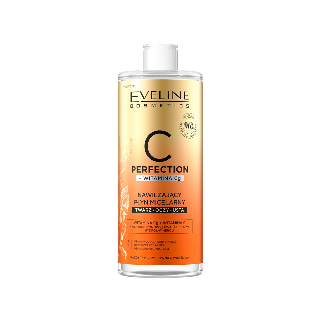 Eveline C-Perfection nawilżający płyn micelarny 500 ml to innowacyjny kosmetyk do codziennego oczyszczania twarzy, oczu i ust. Jego zaawansowana formuła oparta jest na synergicznym działaniu dwóch stabilnych form witaminy C i Cg, które dogłębnie nawilżają, energizują i rozświetlają skórę. Dodatek kwasu ferulowego oraz ekstraktu z cytrusów skutecznie chroni cerę przed szkodliwym działaniem wolnych rodników oraz fotostarzeniem. Płyn nie tylko doskonale usuwa makijaż i zanieczyszczenia, ale też pielęgnuje skórę, przywracając jej młody, zdrowy wygląd, świeżość i naturalny blask.