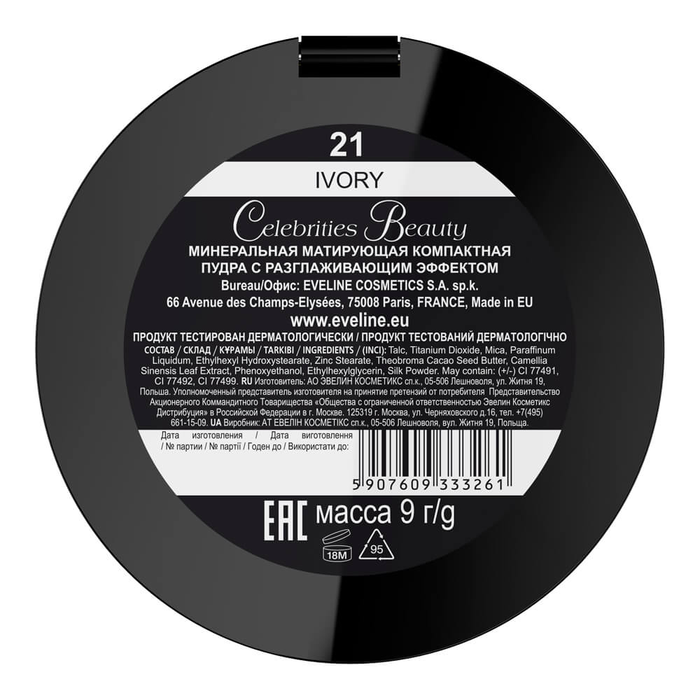 Puder w kamieniu Eveline Celebrities Beauty w odcieniu 021 Ivory to produkt, który łączy w sobie pielęgnację i perfekcyjne wykończenie makijażu. Dzięki wysokiej zawartości naturalnych składników, zapewnia cerze olśniewający wygląd i kompleksową pielęgnację. Delikatna, aksamitna struktura pudru ułatwia jego równomierne rozprowadzanie, doskonale dopasowuje się do cery, nadając jej świeży, jedwabiście-matowy wygląd na cały dzień. Produkt doskonale maskuje niedoskonałości i pochłania nadmiar sebum, nie wysuszając skóry.