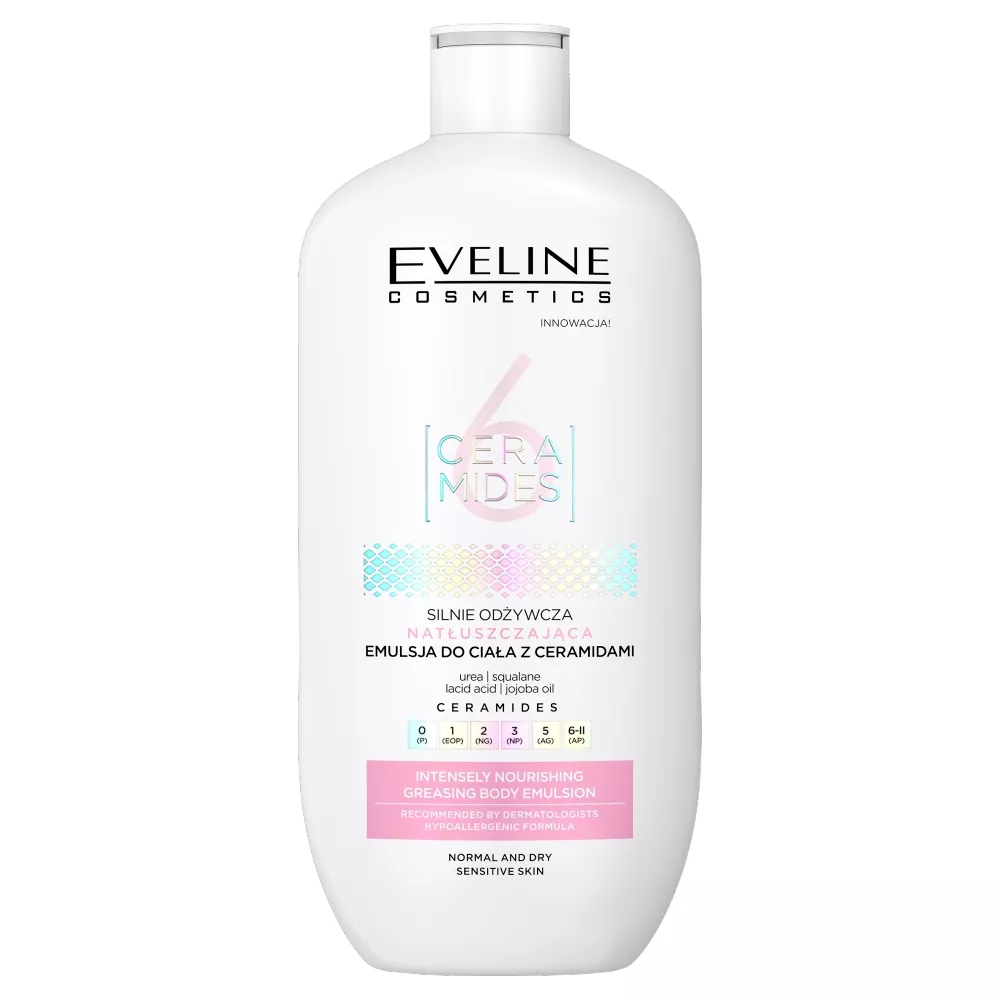 Eveline Cosmetics 6 Ceramides to silnie odżywcza i natłuszczająca emulsja do ciała, opracowana we współpracy z dermatologiem. Formuła tego produktu jest hipoalergiczna, co czyni ją idealną do pielęgnacji skóry wrażliwej, która potrzebuje intensywnego odżywienia i regeneracji.