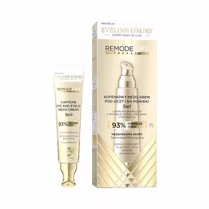 Eveline Cosmetics Eveline d'Aury RemodeLift Therapy Kofeinowy Mezo-Krem pod Oczy 3w1 to zaawansowany produkt pielęgnacyjny, który łączy nowoczesną technologię mikroigłowej mezoterapii z bogactwem składników aktywnych. Dzięki 24 750 mikroigłom Spicules Needles™ krem działa na głębsze warstwy naskórka, stymulując regenerację i poprawiając wygląd okolicy oczu. Regularne stosowanie niweluje cienie, zmniejsza opuchnięcia, oraz wygładza zmarszczki, przywracając skórze młodzieńczy i promienny wygląd.