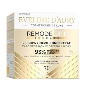 Eveline Cosmetics Eveline d'Aury Remodelift Therapy Lipidowy Mezo-Koncentrat 70+ to zaawansowany krem dla bardzo dojrzałej skóry, który intensywnie regeneruje, odżywia i poprawia strukturę skóry. Dzięki innowacyjnej technologii 165 000 mikroigieł Spicules Needles™ oraz zaawansowanej lipidowej formule z koenzymem Q10, Arganilanem™, skwalanem i tapioką, produkt skutecznie wzmacnia napięcie skóry, poprawiając jej gęstość i sprężystość. Regularne stosowanie przywraca cerze młodszy wygląd i komfort.