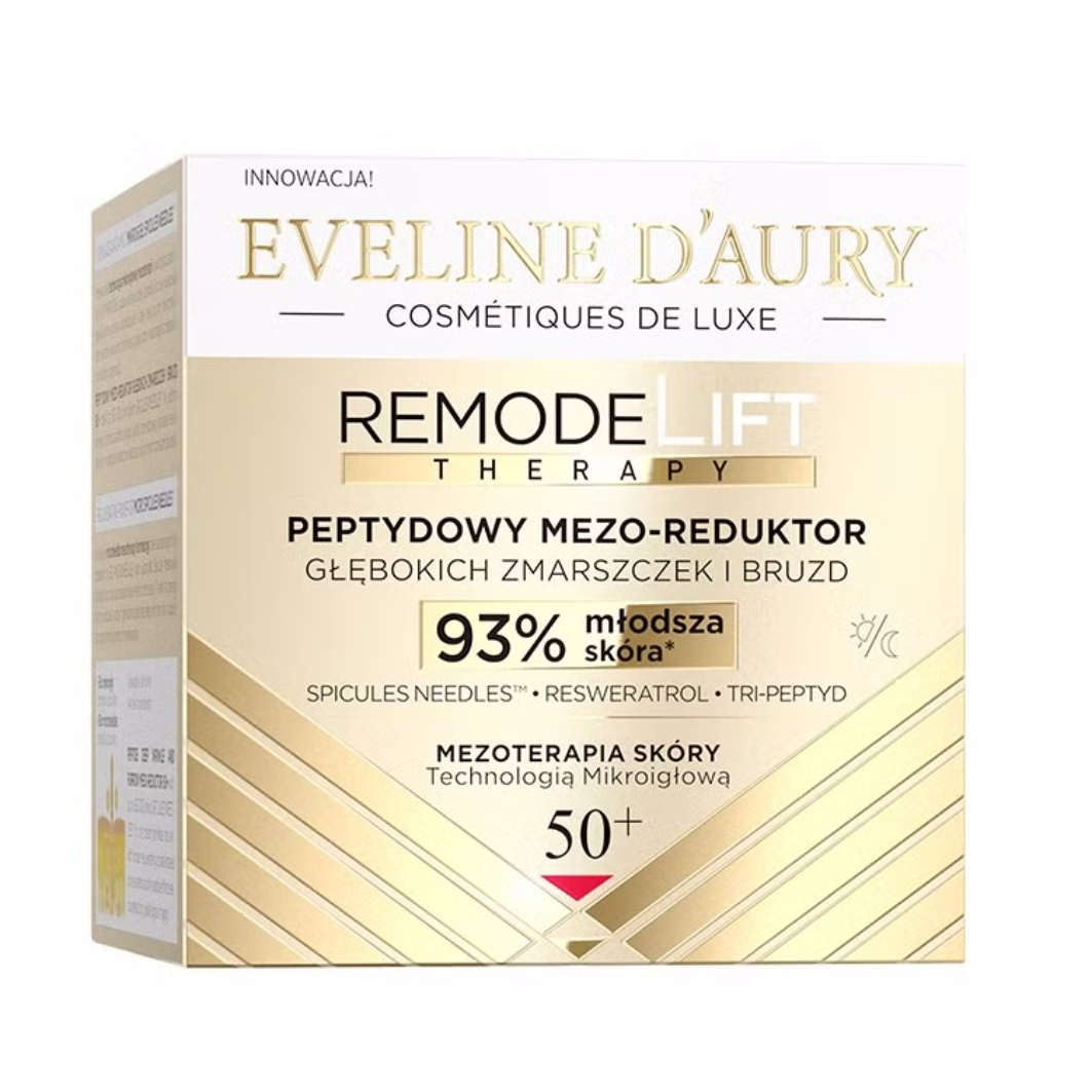 Eveline Cosmetics Eveline d'Aury Remodelift Therapy Peptydowy Mezo-Reduktor Głębokich Zmarszczek i Bruzd 50+ to innowacyjny krem inspirowany technologiami mezoterapii, zaprojektowany specjalnie dla dojrzałej skóry. Dzięki zastosowaniu 165 000 mikroigieł Spicules Needles™ oraz unikalnemu koktajlowi zawierającemu resweratrol, tri-peptyd, niacynamid i odżywcze olejki, działa na najgłębsze warstwy skóry, przywracając jej jędrność i promienny wygląd.