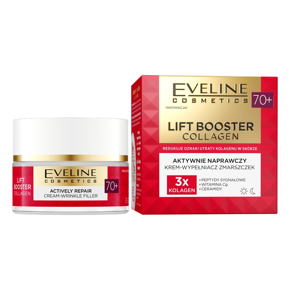 Eveline Cosmetics Lift Booster Collagen aktywnie naprawczy krem-wypełniacz zmarszczek 70+ to zaawansowany eliksir młodości stworzony z myślą o dojrzałej skórze po 70. roku życia. Krem działa kompleksowo: intensywnie wygładza zmarszczki, uelastycznia i nawilża cerę, a także skutecznie modeluje owal twarzy. Bogactwo kolagenu w aż trzech postaciach, peptydy sygnałowe, witamina C oraz ceramidy zapewniają głębokie odżywienie i regenerację skóry, pomagając zatrzymać oznaki upływającego czasu. Pierwsze efekty widoczne są już po miesiącu stosowania!