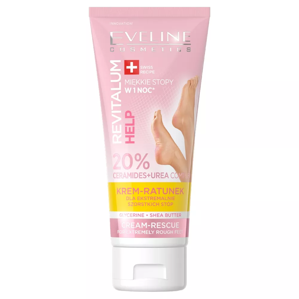 Eveline Cosmetics Revitalum krem-ratunek dla ekstremalnie szorstkich stóp to innowacyjny produkt, stworzony z myślą o natychmiastowym ukojenie dla bardzo szorstkiej i zmęczonej skóry stóp. Jego zaawansowana receptura działa jako regenerujący opatrunek, oferując Twoim stopom odżywienie i poprawę kondycji. Zawiera 20% kompleks z ceramidami i urea, masło shea oraz glicerynę, które zapewniają głębokie nawilżenie oraz szybką regenerację naskórka. Już po pierwszym użyciu Twoje stopy odzyskają aksamitną gładkość i ulgę.