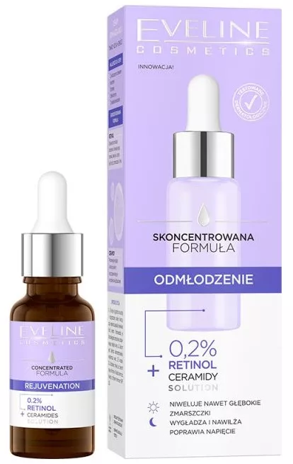 Skoncentrowane serum do twarzy Eveline Cosmetics działa przeciwstarzeniowo, zmniejsza widoczność zmarszczek, poprawia jędrność, a ponadto działa nawilżająco. Dzięki temu kosmetykowi cera wygląda młodziej i jest wypoczęta. W składzie znajduje się 0,2% retinol, który zapobiega przedwczesnemu starzeniu. Ponadto ceramidy odżywiają skórę i regenerują ją.