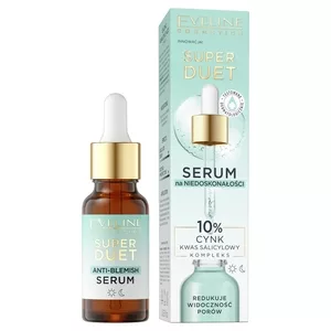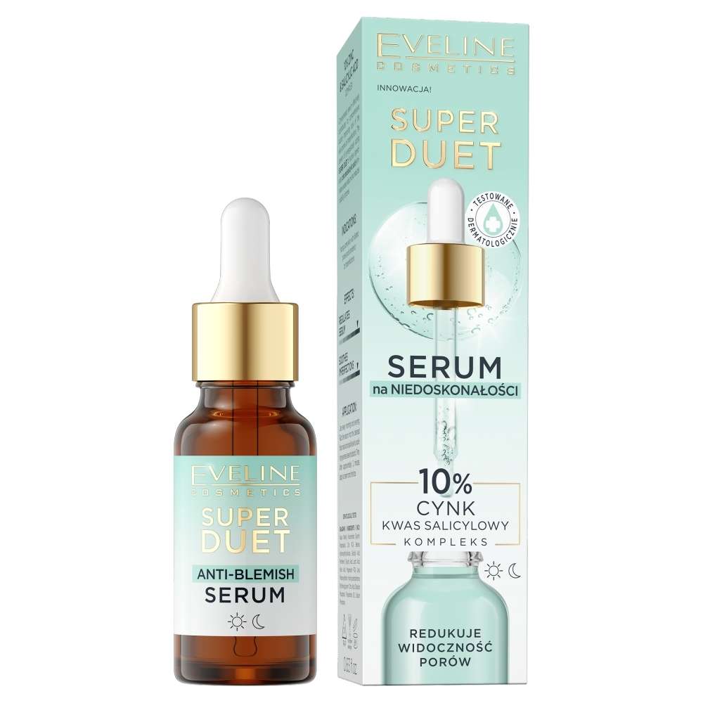 Innowacyjne serum na niedoskonałości Eveline Cosmetics Super Duet z kompleksem 10% cynku i kwasu salicylowego zostało stworzone, aby zaoferować skuteczne rozwiązanie dla skóry skłonnej do niedoskonałości. Dzięki wyjątkowej formule, w której znajdziesz "super duet" składników aktywnych – 10% cynk oraz kwas salicylowy, produkt działa wielokierunkowo. Cynk jest znany ze swojej zdolności do regulacji produkcji sebum, co przyczynia się do zmniejszenia wyświecania się cery i zapobiegania powstawaniu nowych niedoskonałości. Kwas salicylowy pomaga w oczyszczaniu porów i odświeżaniu powierzchni skóry, co prowadzi do zredukowania ich widoczności. Serum ma lekką konsystencję, która szybko się wchłania, pozostawiając skórę miękką i odświeżoną bez uczucia lepkości. Delikatny, niemal niewyczuwalny zapach sprawia, że stosowanie produktu jest przyjemne i komfortowe. To serum jest idealne dla osób z cerą młodą, trądzikową, z rozszerzonymi porami i skłonnością do powstawania niedoskonałości. Sprawdzi się zarówno u osób borykających się z przetłuszczaniem, jak i z poszukiwaniem skutecznej, delikatnej pielęgnacji.