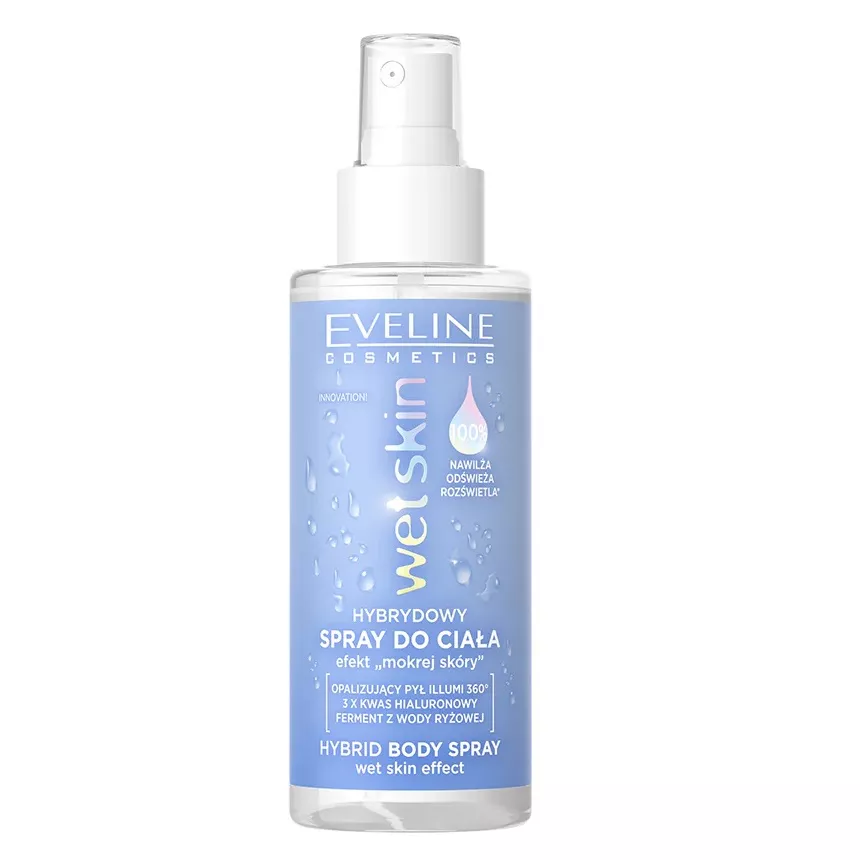 Eveline Cosmetics Wet Skin hybrydowy spray do ciała to innowacyjna pielęgnacja, która pozostawia efekt mokrej skóry. Ten ultralekki spray zapewnia hybrydowe działanie 3 w 1, łącząc wygładzenie, nawilżenie oraz rozświetlenie skóry. Produkt działa jak magiczny filtr opalizujący, gwarantując spektakularny wygląd w każdych warunkach.