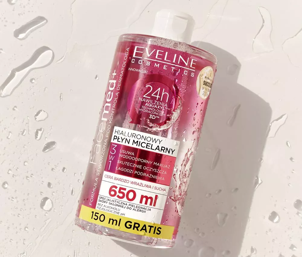 Hialuronowy płyn micelarny 3w1 Eveline Facemed+ to doskonały wybór dla osób z bardzo suchą, podrażnioną i wrażliwą skórą. Produkt został stworzony z myślą o skutecznym demakijażu oczu i ust, nawet w przypadku wodoodpornych kosmetyków, oraz codziennej pielęgnacji odwodnionej cery.