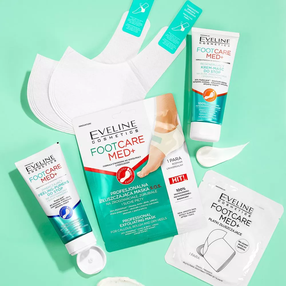 Profesjonalna złuszczająca maska Eveline Foot Care Med+ to produkt do samodzielnego użytku w domu, który intensywnie pielęgnuje pięty i działa w miejscach, gdzie najczęściej tworzą się zgrubienia. Opracowana we współpracy z podologiem formuła maski bazuje na unikalnych składnikach, które skutecznie stymulują proces eksfoliacji zrogowaciałego naskórka, pozostawiając pięty gładkie, miękkie i delikatne.