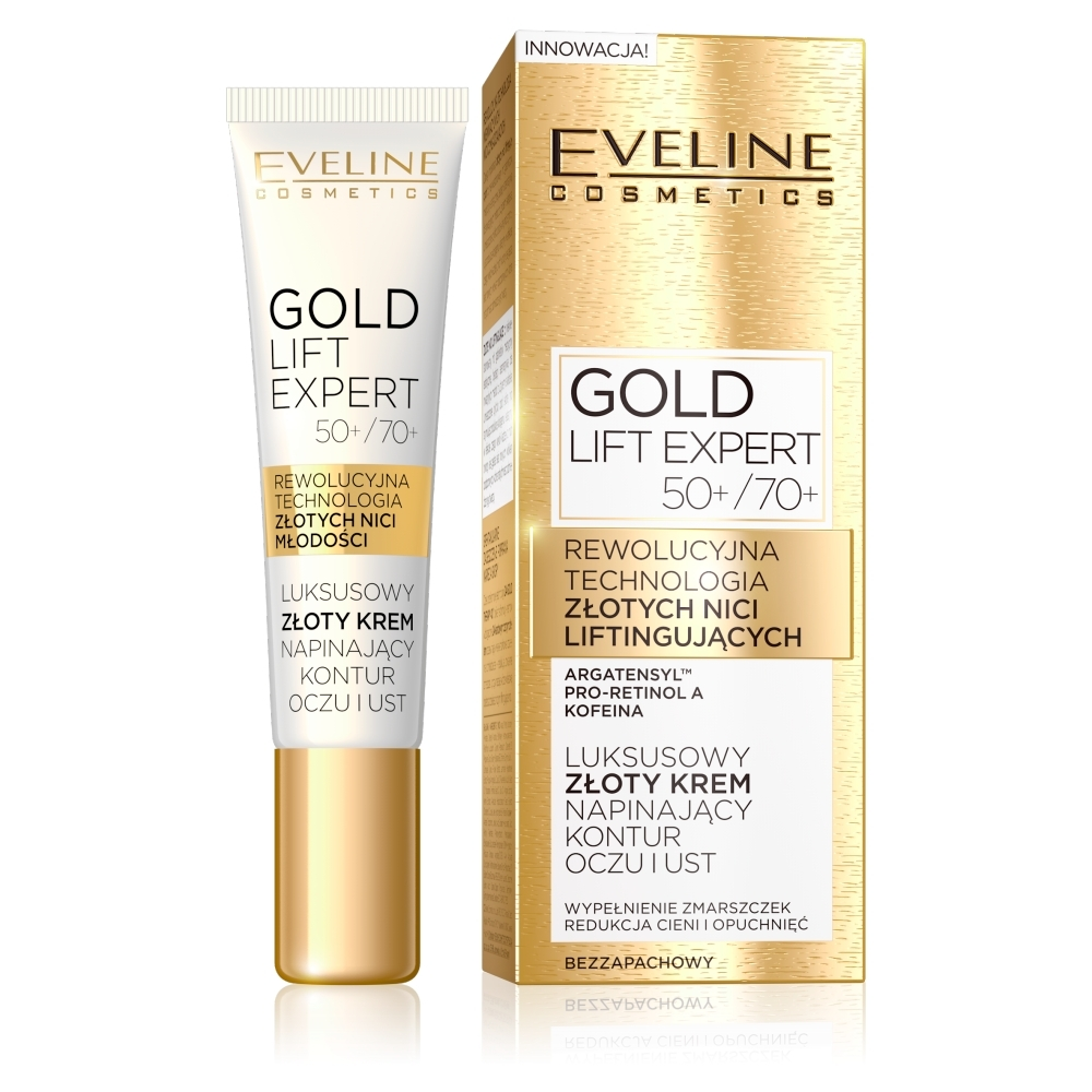 Luksusowy krem Eveline Gold Lift Expert to idealne rozwiązanie dla osób w wieku 50+ i 70+, pragnących poprawić jędrność i kontur skóry wokół oczu i ust. Dzięki zaawansowanym kompleksom Anti-Age i drobinkom czystego 24K złota, produkt oferuje wielowymiarowy lifting, stymulując intensywną syntezę kolagenu. Krem nie tylko wygładza i liftinguje skórę, ale również rozjaśnia przebarwienia, przywracając jej świetlisty wygląd.