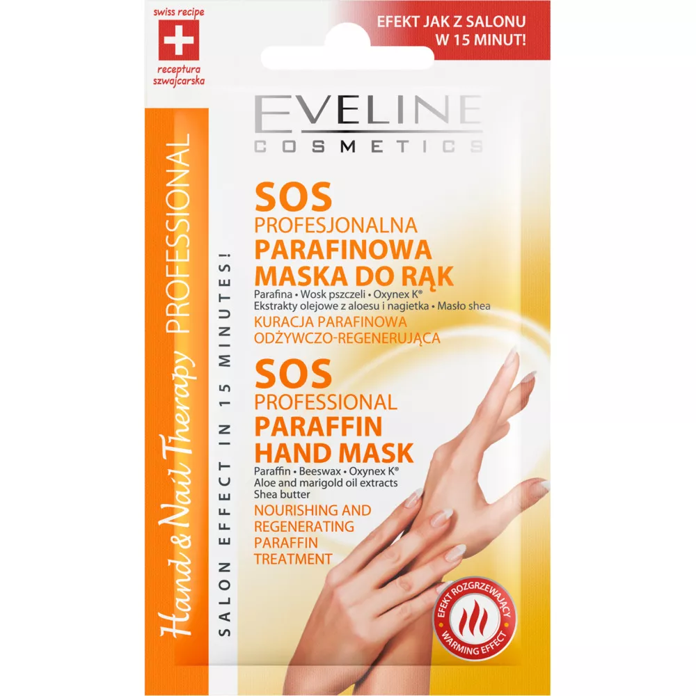Rozgrzewająca maska Eveline Hand & Nail Therapy Professional to doskonałe rozwiązanie dla osób pragnących zregenerować i odżywić suchą oraz zniszczoną skórę dłoni. Jej unikalna formuła, zawierająca parafinę i wosk pszczeli, zapewnia długotrwałe nawilżenie, uelastycznienie, zmiękczenie i wygładzenie skóry. Dzięki kompleksowi Oxynex K® maska odmładza delikatną skórę dłoni i chroni ją przed szkodliwym wpływem czynników zewnętrznych. Skutecznie likwiduje oznaki starzenia, napina skórę oraz rozjaśnia plamy i przebarwienia.