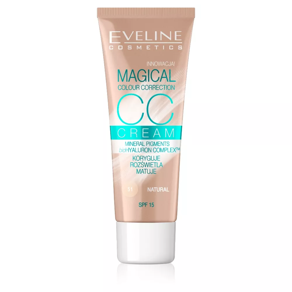 CC Cream Eveline Magical Colour Correction to multifunkcyjny podkład idealny do pielęgnacji każdego typu cery. Dzięki formule Magical Colour Correction, krem zaraz po aplikacji zmienia się w lekki fluid matujący, który nadaje cerze jednolity i naturalny koloryt. Naturalne pigmenty mineralne zamknięte w mikrokapsułkach stopniowo uwalniają się, długotrwale korygując niedoskonałości. Innowacyjny bioHYALURON Complex™ zawiera skoncentrowany kwas hialuronowy o właściwościach nawilżających i wygładzających, dzięki czemu cera wygląda naturalnie, nieskazitelnie i promiennie.