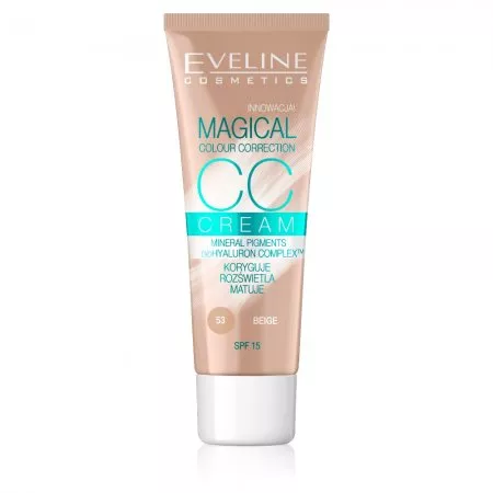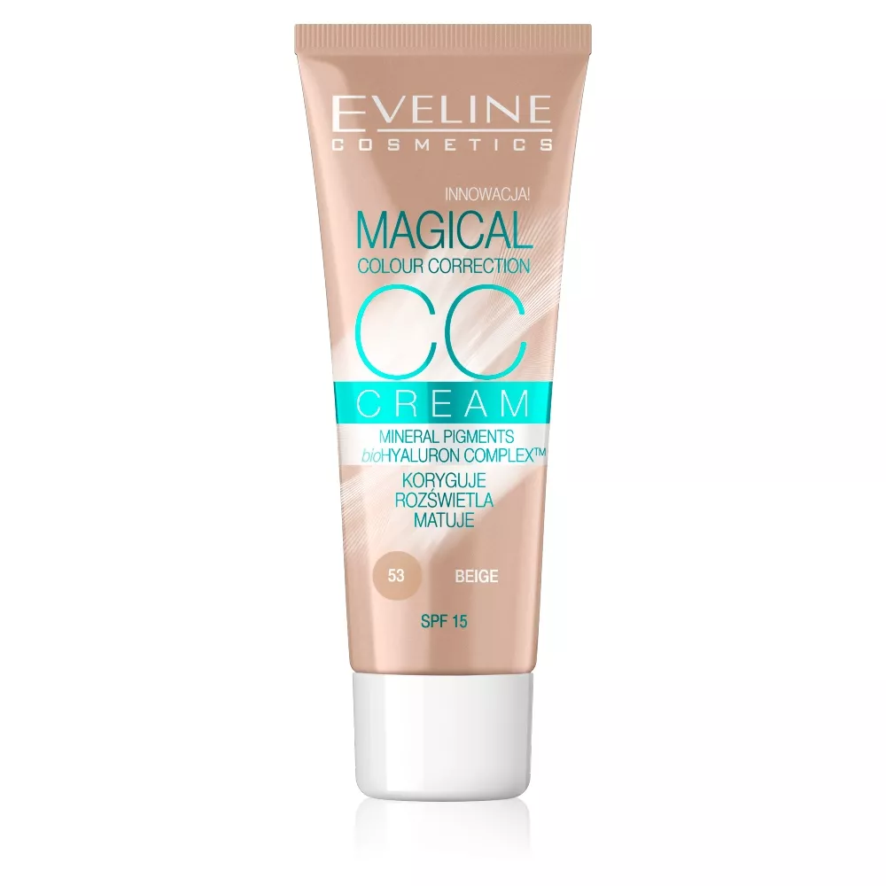 Eveline Magical Colour Correction CC to multifunkcyjny podkład, który doskonale sprawdzi się w pielęgnacji każdego typu cery. Dzięki innowacyjnej formule Magical Colour Correction, produkt natychmiast po aplikacji przekształca się w lekki fluid matujący, zapewniając skórze jednolity i naturalny koloryt. Zawarte w mikrokapsułkach naturalne pigmenty mineralne stopniowo korygują niedoskonałości skóry, a bioHYALURON Complex TM, czyli skoncentrowany kwas hialuronowy, zapewnia intensywne nawilżenie i wygładzenie.