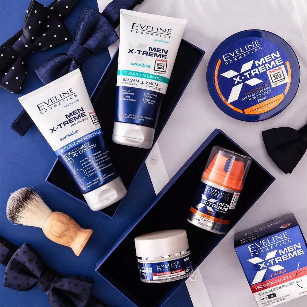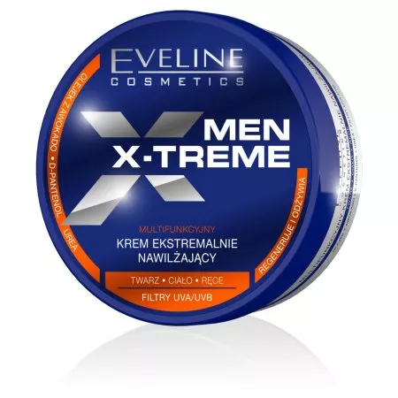 Eveline Men X-Treme to multifunkcyjny krem ekstremalnie nawilżający do twarzy i ciała o pojemności 200 ml. Jego lekka formuła błyskawicznie niweluje uczucie suchości i ściągnięcia skóry, łagodzi podrażnienia oraz zapewnia 24-godzinne uczucie komfortu.
