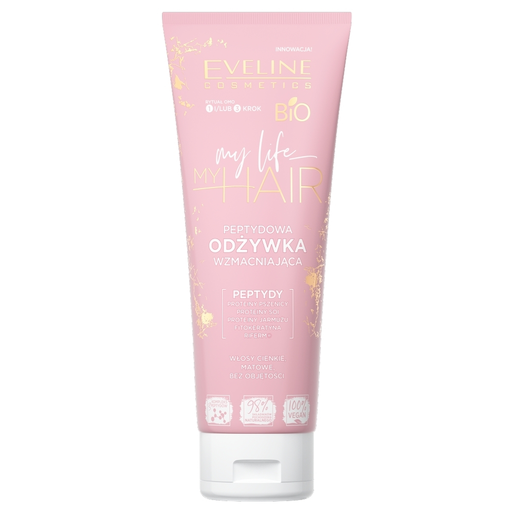Peptydowa odżywka My Life My Hair od Eveline to wyjątkowy produkt bogaty w proteiny, który wypełnia ubytki i uszkodzenia włosów, skutecznie odbudowując je i wzmacniając. Dzięki unikalnemu połączeniu kompleksu 3 peptydów oraz 5 składników aktywnych naturalnego pochodzenia, włosy stają się silniejsze i grubsze w dotyku. Idealna dla włosów cienkich, matowych, bez objętości, oklapniętych i łamliwych, odżywka stanowi kluczowy element rytuału OMO.