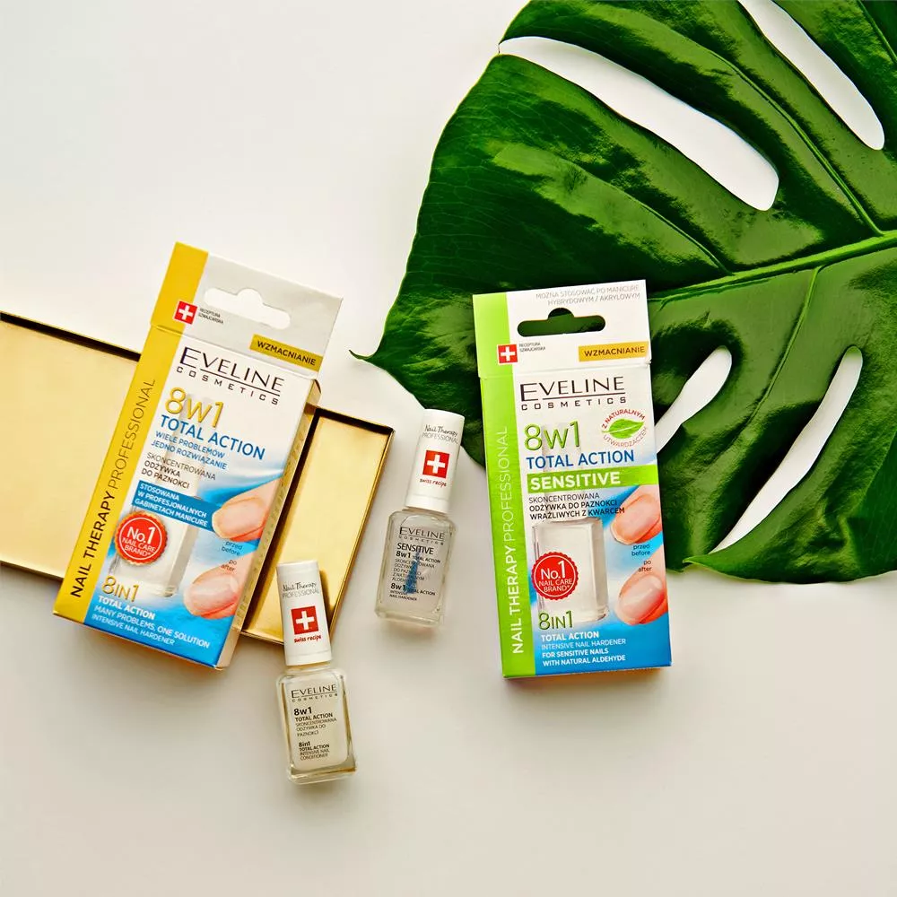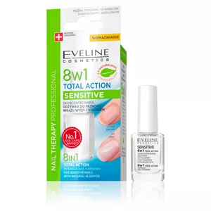 Wersja Sensitive bestsellerowej odżywki 8w1 Total Action jest idealna dla wrażliwych paznokci. Specjalnie opracowana formuła zawiera naturalny aldehyd, co zapewnia delikatną, ale skuteczną pielęgnację. Odżywka wnika w strukturę paznokcia, regeneruje ją, odbudowuje, uszczelnia, utwardza i wspomaga wzrost. Uelastycznia płytkę paznokcia, czyniąc ją odporną na mechaniczne uszkodzenia oraz zabezpiecza przed pękaniem, łamaniem i rozdwajaniem. Sprawia, że zniszczone, matowe paznokcie odzyskują gładkość i połysk. Produkt zasycha na paznokciach jako warstwa ochronna i przedłuża trwałość lakieru. Produkt testowany dermatologicznie.