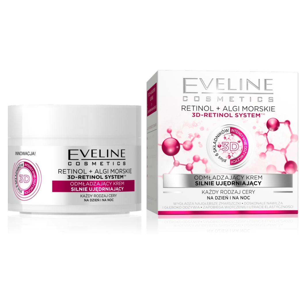 Jeden krem, podwójna moc. Eveline odmładzający krem silnie ujędrniający z retinolem i algami morskimi to innowacyjne połączenie naturalnych i zaawansowanych technologicznie składników, które zapewnia skórze zdrowy i młody wygląd. Receptura wzbogacona o sześć aktywnych składników odżywczych działa synergicznie, poszerzając spektrum działania kremu. Produkt polecany jest do każdego rodzaju cery.