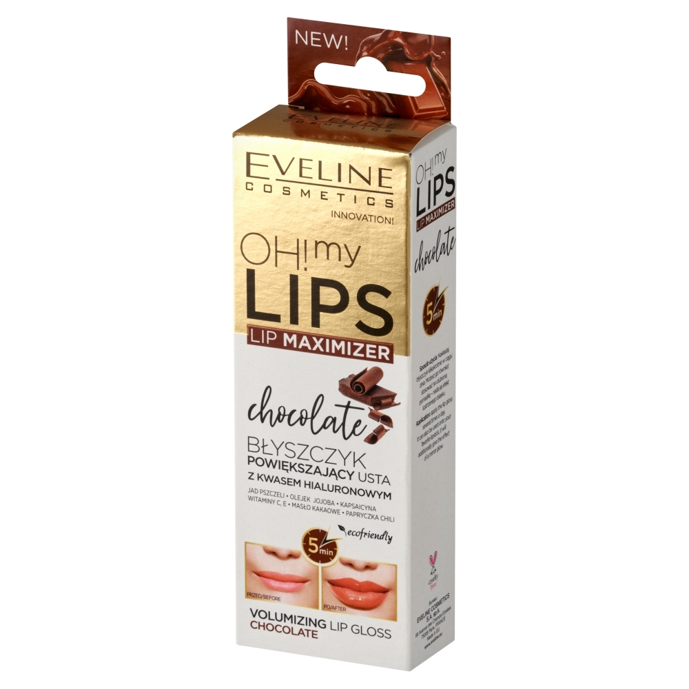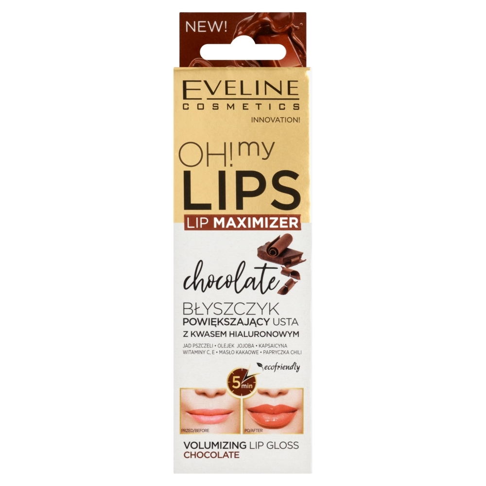 Do znanej i docenianej serii OH! My Lips dołączył błyszczyk powiększający usta o apetycznym zapachu czekolady. Dzięki zastosowanej technologii Volume Maximize™, błyszczyk zawiera wyciąg z papryczki chili i jad pszczeli, które rozszerzają naczynka krwionośne i przyspieszają mikrokrążenie. Mikrocząsteczki kwasu hialuronowego błyskawicznie wnikają w głębokie warstwy skóry, wypełniając je, co sprawia, że usta stają się widocznie powiększone. Dodatek olejów z awokado, konopnego, makadamia i rycynowego, a także witaminy i ekstraktu z imbiru, odżywia i zmiękcza delikatny naskórek oraz podkreśla naturalny kolor warg. Apetyczny zapach czekolady sprawia, że aplikacja kosmetyku jest niezwykłą przyjemnością.