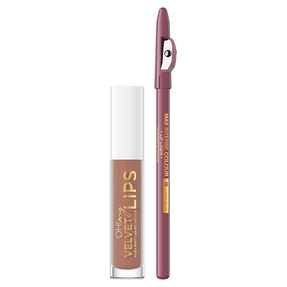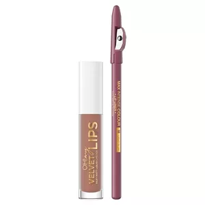 Oh! My Velvet Lips to zestaw idealnie dobranych kosmetyków do makijażu ust: aksamitna matowa pomadka w płynie i konturówka w tym samym kolorze. Formuła, bogata w witaminę E i MOIST-IN COLOUR SYSTEM™, przywraca ustom optymalny poziom nawilżenia. Długotrwała, nasycona mikropigmentami receptura pomadki zapewnia ustom doskonałe krycie na wiele godzin. Wygodny aplikator gwarantuje równomierne rozprowadzenie pomadki, nadając makijażowi perfekcyjne, matowe wykończenie w kilka sekund. Konturówka, o gładkiej, kremowej formule, pozwala na precyzyjne modelowanie i idealne podkreślenie linii ust oraz wypełnienie konturu kolorem. Piękny, czekoladowy zapach sprawia, że makijaż jest jeszcze większą przyjemnością!