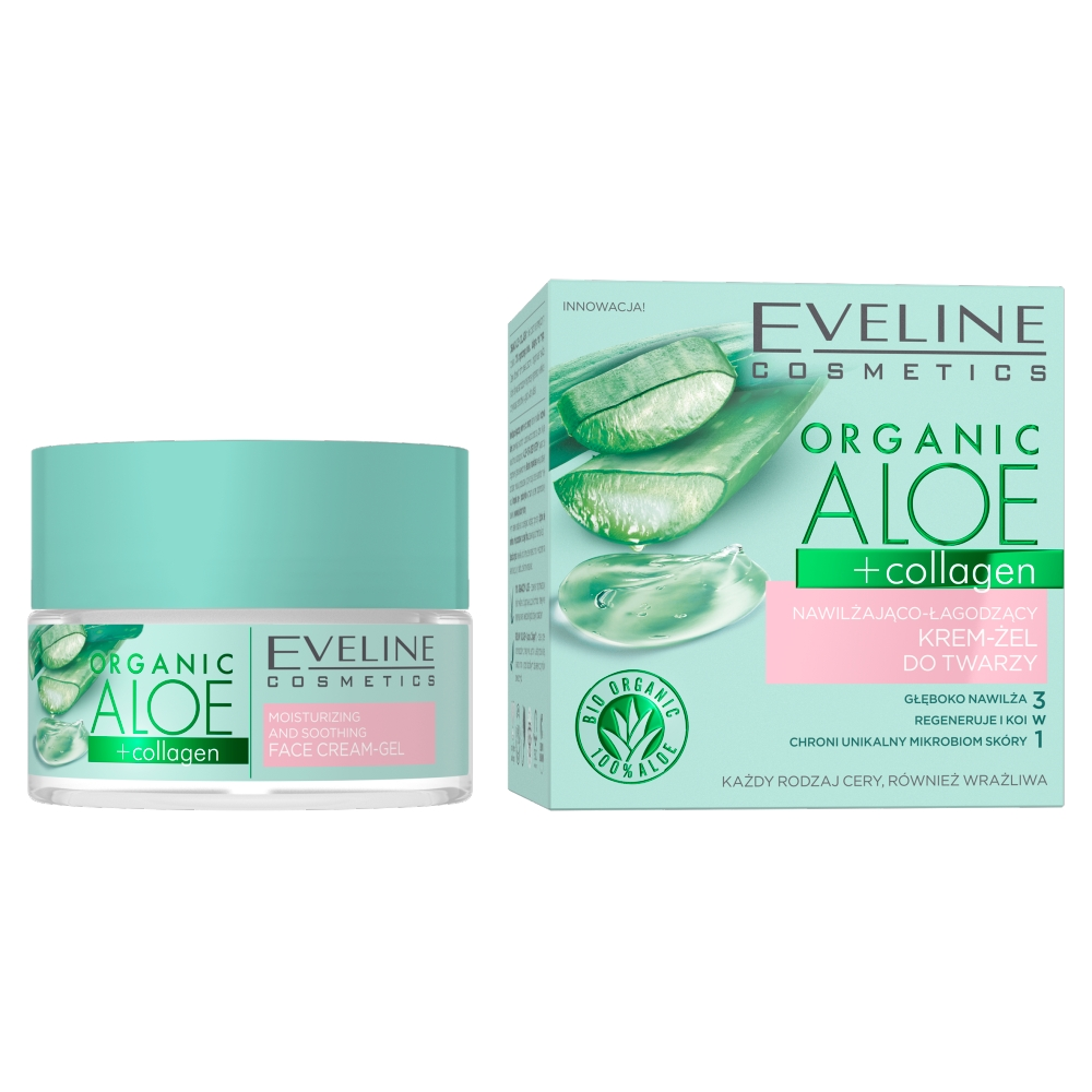 Nawilżająco-łagodzący krem-żel do twarzy Eveline Organic Aloe + Collagen intensywnie koi i odżywia skórę, zapewniając jej komfort i uczucie świeżości przez cały dzień. Wyjątkowa formuła wzbogacona o Aloe Hydra Deep System™ gwarantuje długotrwałe i głębokie nawodnienie. Betaina i masło shea niwelują objawy podrażnień, redukują przesuszenia i przywracają cerze aksamitną miękkość. Kompleks pre- i prebiotyków wzmacnia system odpornościowy naskórka i wyrównuje koloryt skóry. Krem idealnie nadaje się do pielęgnacji każdego typu cery. Szybko się wchłania i nie pozostawia tłustego filmu, zapewniając komfort aplikacji. Organic Aloe + Collagen to linia oparta na synergicznym działaniu 100% organicznego aloesu i kolagenu roślinnego. Dzięki ultralekkim formułom skutecznie i długotrwale nawilża skórę i aktywuje zachodzące w niej procesy regeneracji, w efekcie przywracając cerze zdrowy wygląd i witalny blask.