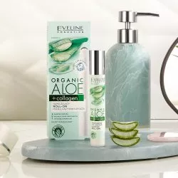 Nawilżający roll-on modelujący kontur oczu Eveline Organic Aloe + Collagen intensywnie koi, nawilża i chroni delikatną skórę wokół oczu. Wyjątkowa formuła wzbogacona Aloe Hydra Deep System™ gwarantuje długotrwałe i głębokie nawodnienie. Adipoless™ oraz Cytobiol™ Lumin-Eye błyskawicznie redukują widoczne oznaki zmęczenia takie jak cienie czy opuchnięcia. Acacia Collagen™ i bioferment Wakame oraz bioPullulan wygładzają drobne linie i zmarszczki. Roll-on idealnie nadaje się do pielęgnacji każdego typu cery. Szybko się wchłania, przyjemnie chłodzi i nie pozostawia tłustego filmu, zapewniając komfort aplikacji. Organic Aloe + Collagen to linia oparta na synergicznym działaniu 100% organicznego aloesu i kolagenu roślinnego. Dzięki ultralekkim formułom skutecznie i długotrwale nawilża skórę i aktywuje zachodzące w niej procesy regeneracji, w efekcie przywracając cerze zdrowy wygląd i witalny blask.