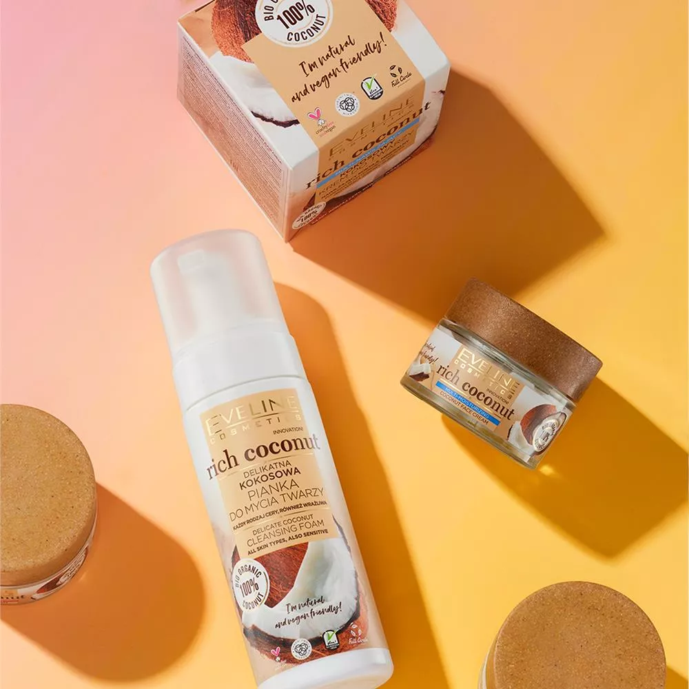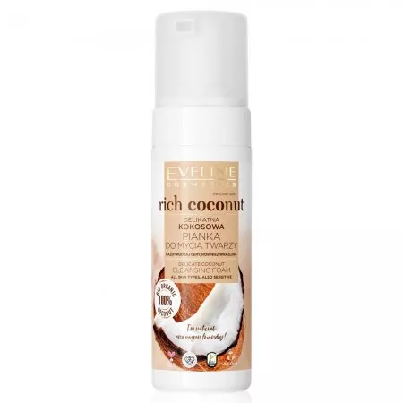 Odkryj naturalną, ultradelikatną piankę do mycia twarzy Eveline Rich Coconut, stworzoną na bazie bio wody kokosowej, która dokładnie usuwa zanieczyszczenia i nadmiar sebum. Dzięki łagodnej formule opartej w 96% na składnikach pochodzenia naturalnego, Twoja skóra będzie dokładnie oczyszczona, rozświetlona i jedwabiście miękka. Kompleks probiotyczny chroni unikalny mikrobiom skóry, zapewniając jej zdrowy wygląd.
